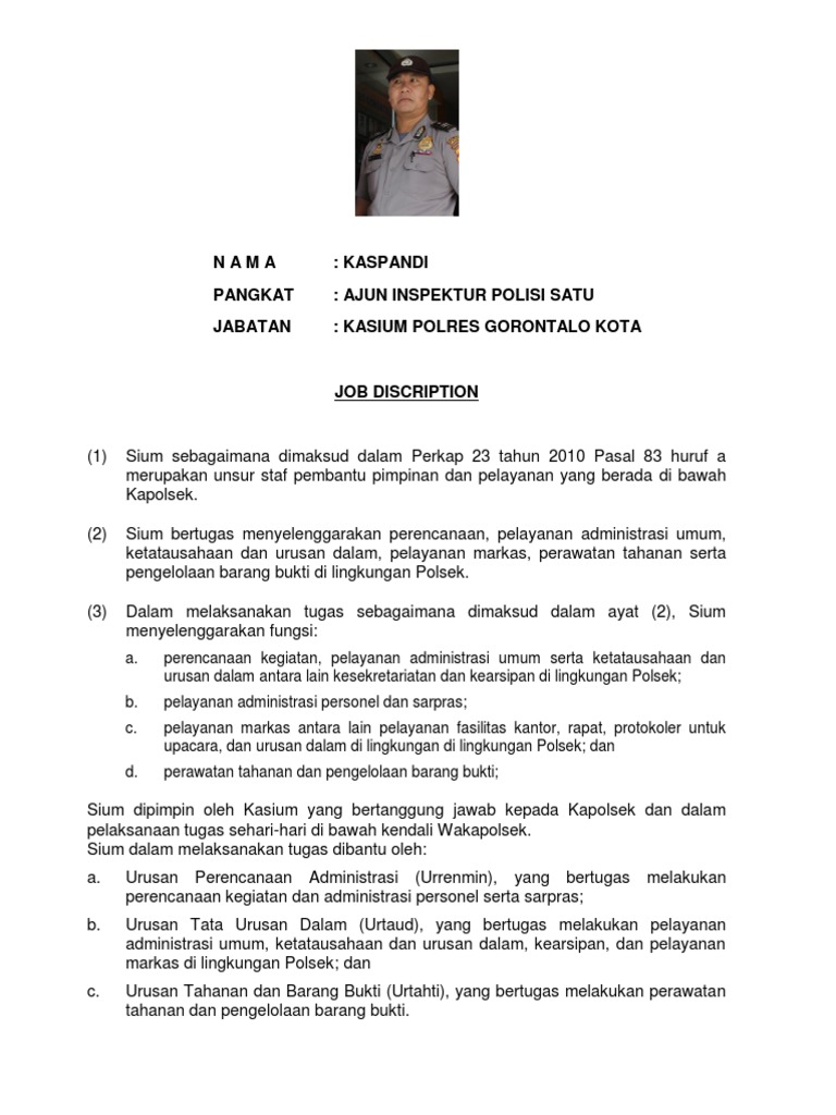 Lowongan Kerja BUMN Perum Perhutani. KASIUM POLSEK SAKRA BARAT SATUAN KERJA. Sium merupakan unsur staf pembantu pimpinan dan pelayanan yang berada di bawah Kapolsek.