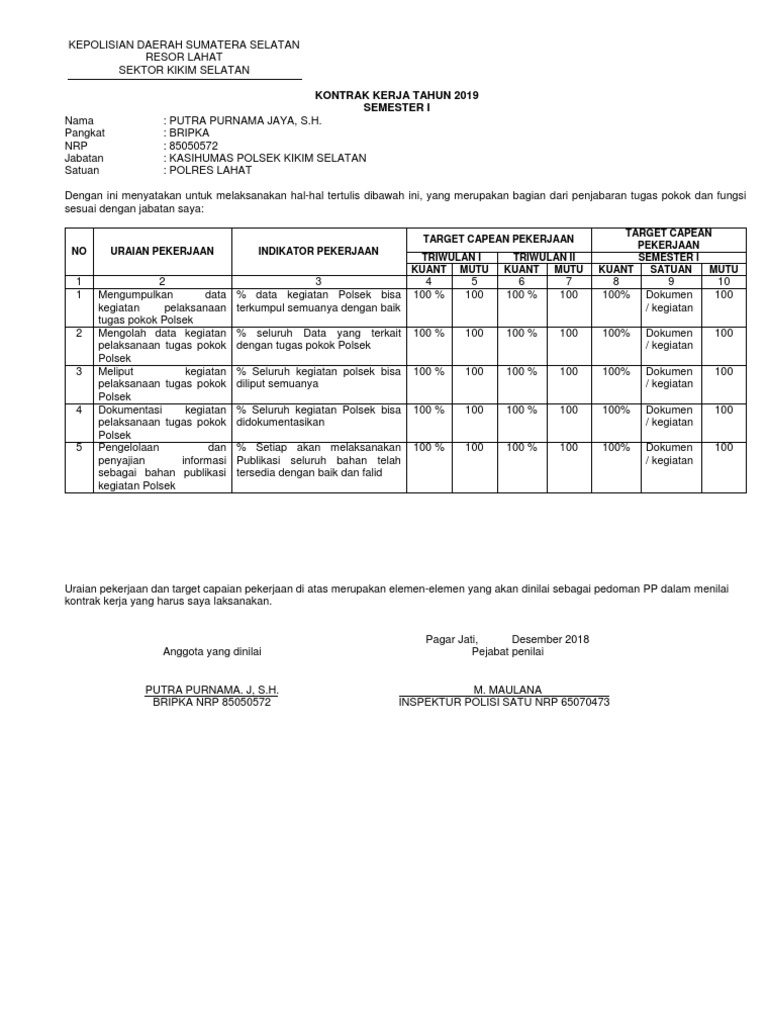 POLRES LOMBOK TIMUR Dengan ini menyatakan kesepakatan untuk melaksanakan hal-hal tertulis dibawah ini yang merupakan bagian dari penjabaran tugas pokok dari fungsi sesuai dengan jabatan saya NO Faktor Kinerja Standar Kinerja Keterangan 1 Perencanaan kegiatan Melakukan perencanaan kegiatan. Terdapat pemberi kerja serta pihak yang dipekerjakan. Unsur pimpinan polri secara berjenjang 1.
